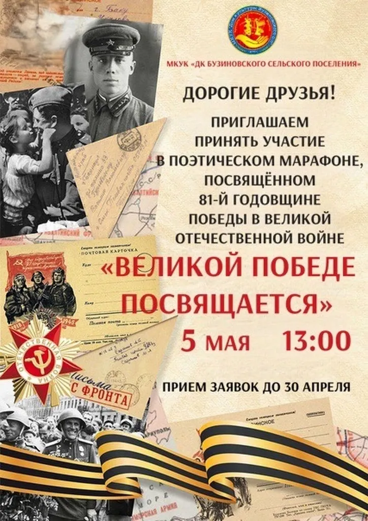 Дом культуры станицы Бузиновской приглашает вас принять участие в поэтическом марафоне, посвящённом 81-й годовщине Победы в Великой Отечественной войне!